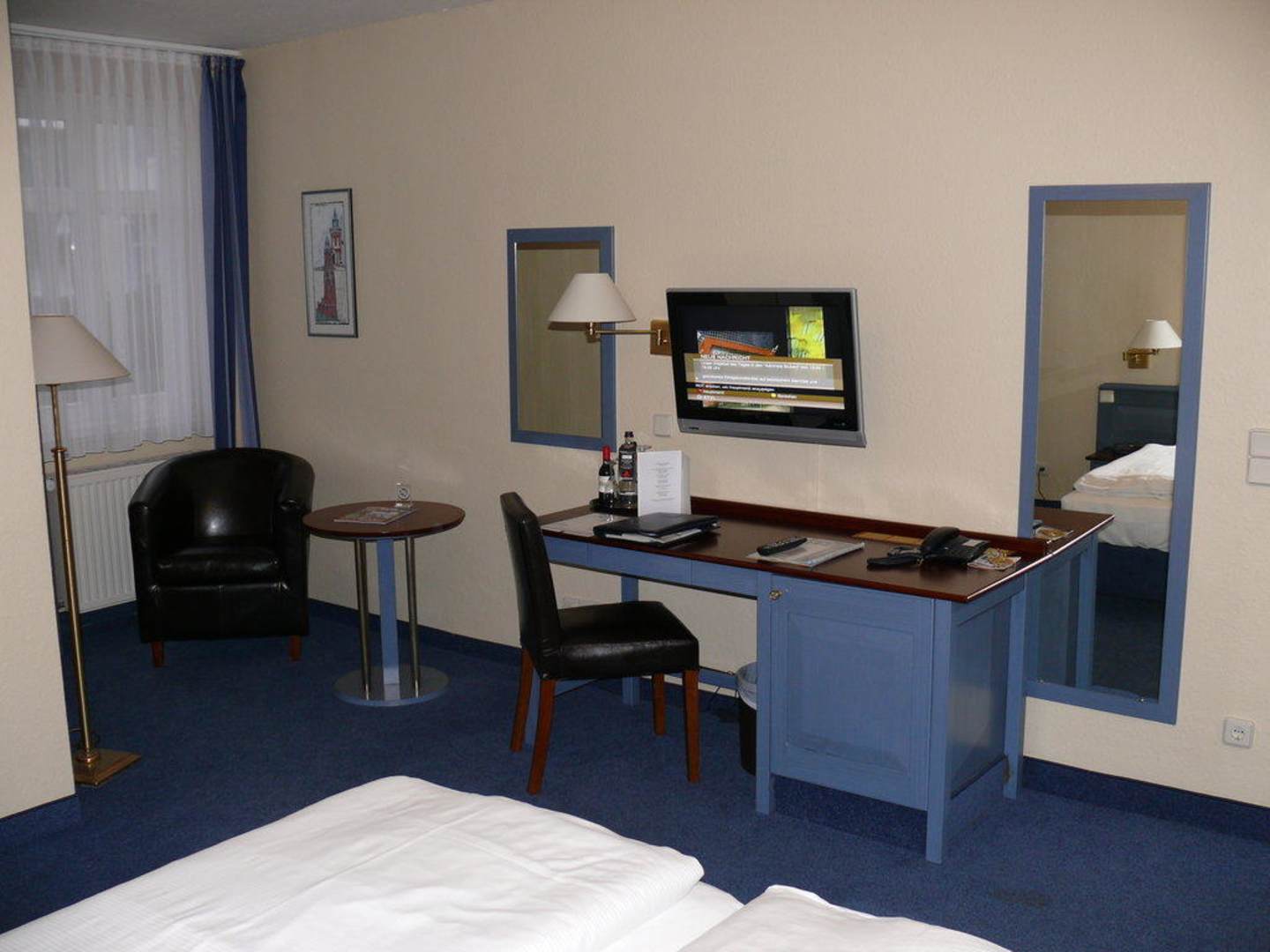 ZimmereinrichtungSchreibtisch mit Minibar. Großer Fernseher an der Wand. Sessel mit Beistelltisch und Leselampe.
