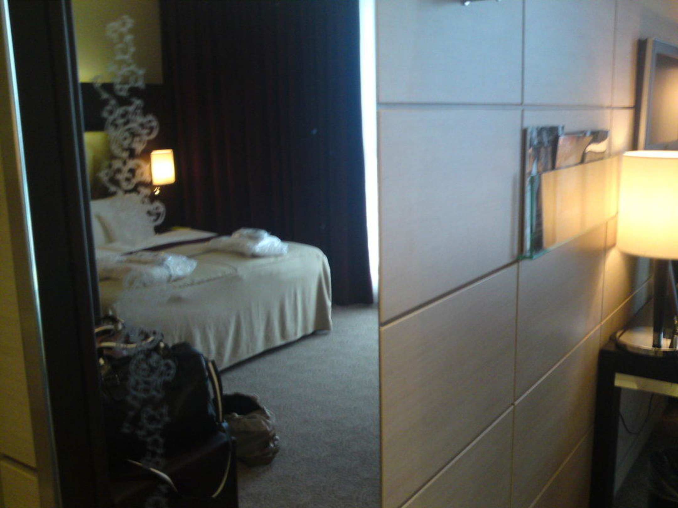Bett vom Eingang aus links neben dem Bild ist die Eingangstür. Das Bild ist quasi spiegelverkehrt. Unterhalb der Lampe steht der Schreibtisch