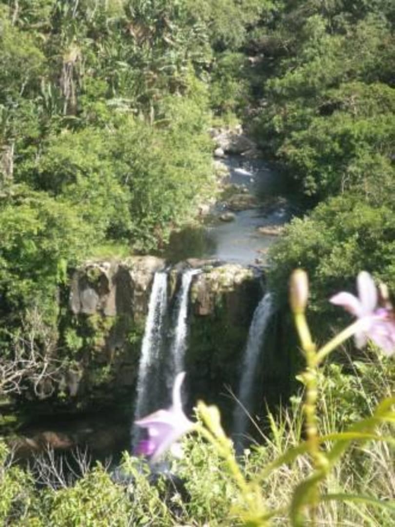 Blick unmittelbar vom Bungalow auf die Cascade Léon im Tal.