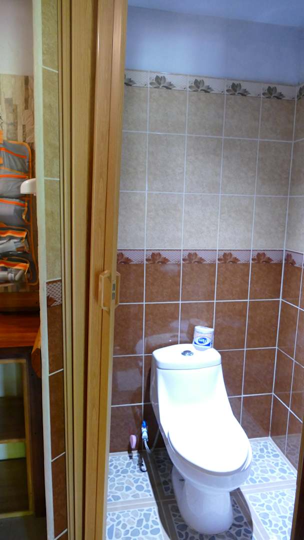 Badezimmer, rechter Teil, das WC mit Chemiestein