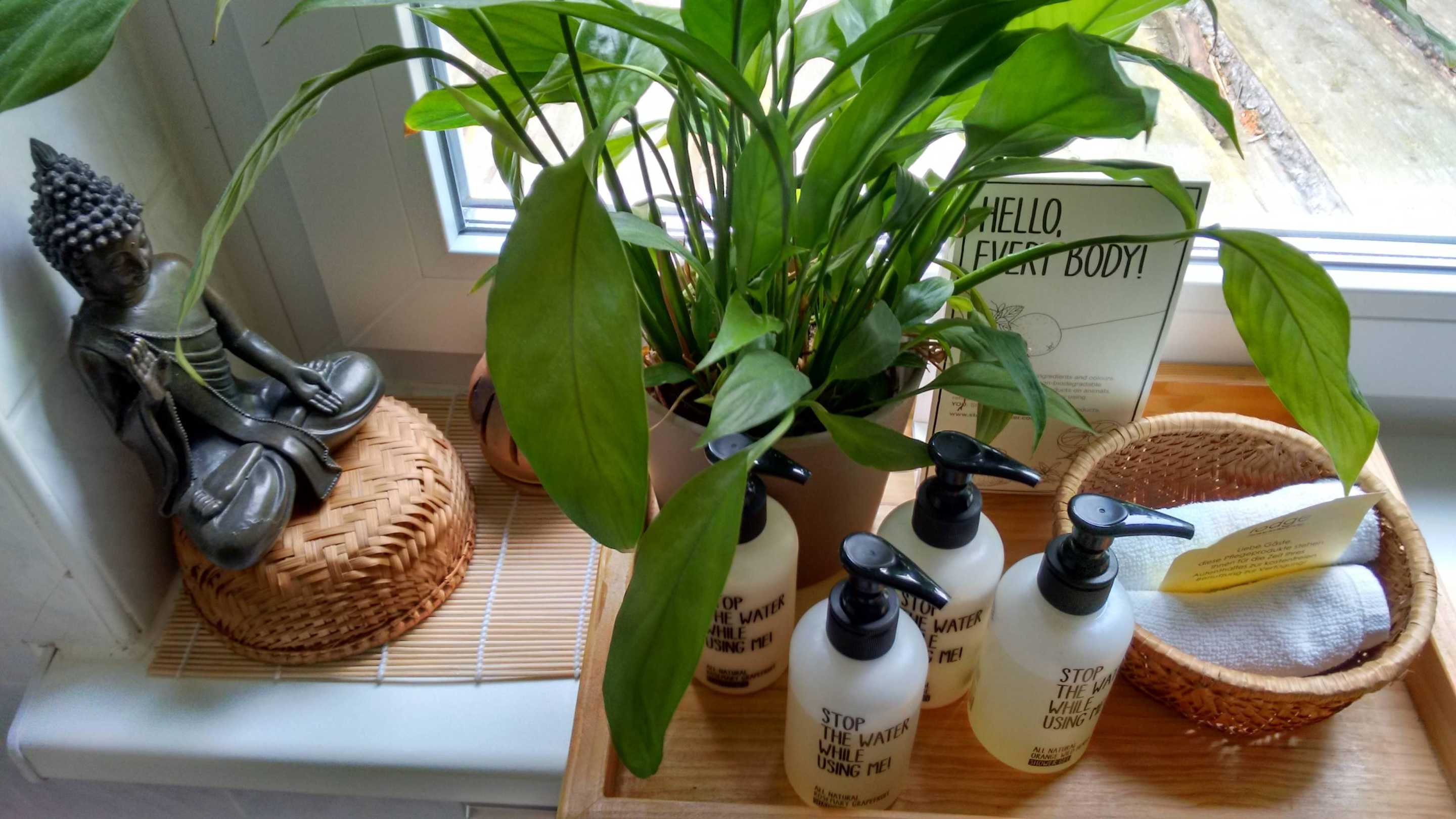 Bad mit Pflegeproduktenauf dem Fensterbrett
