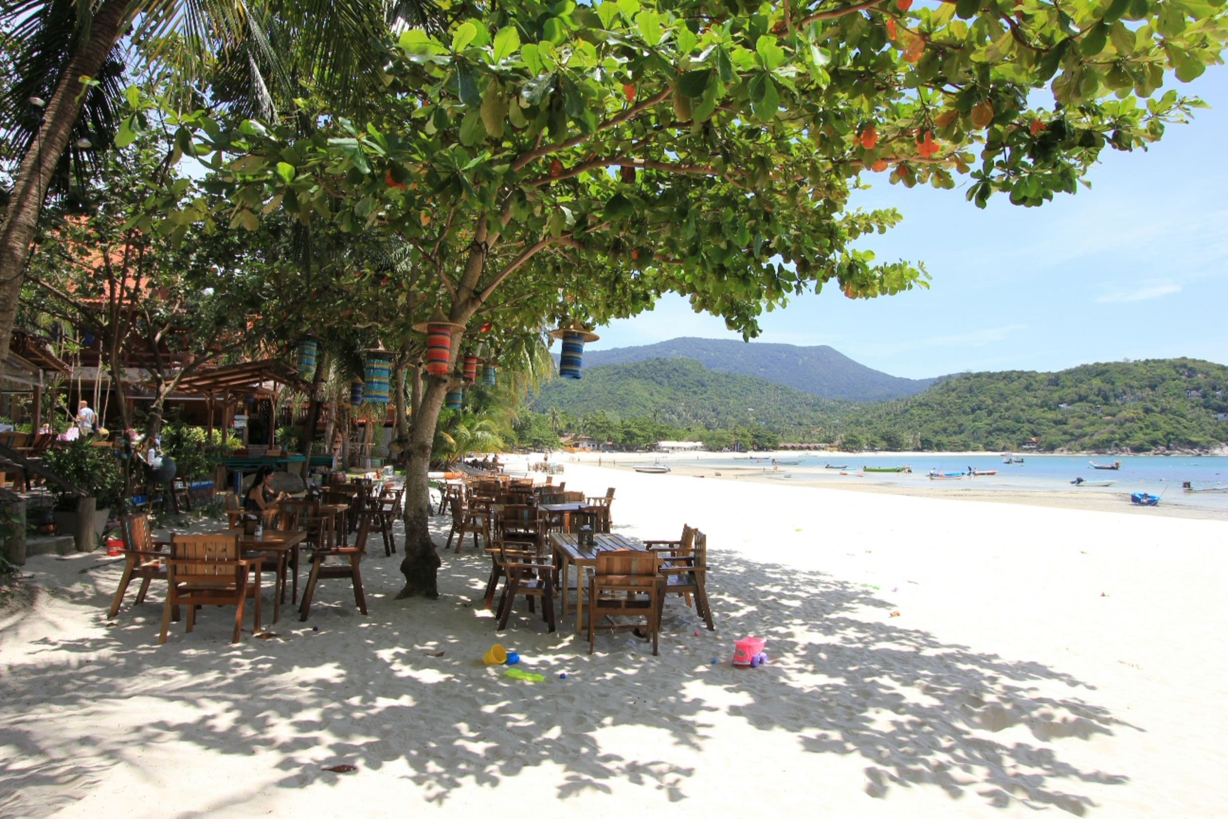 Restaurant unter Bäumen direkt am Strand