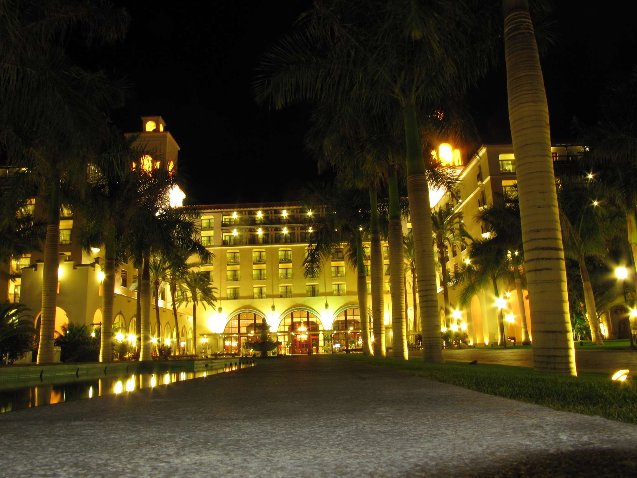 Das Hotel von der Hoteleinfahrt aus bei Nacht