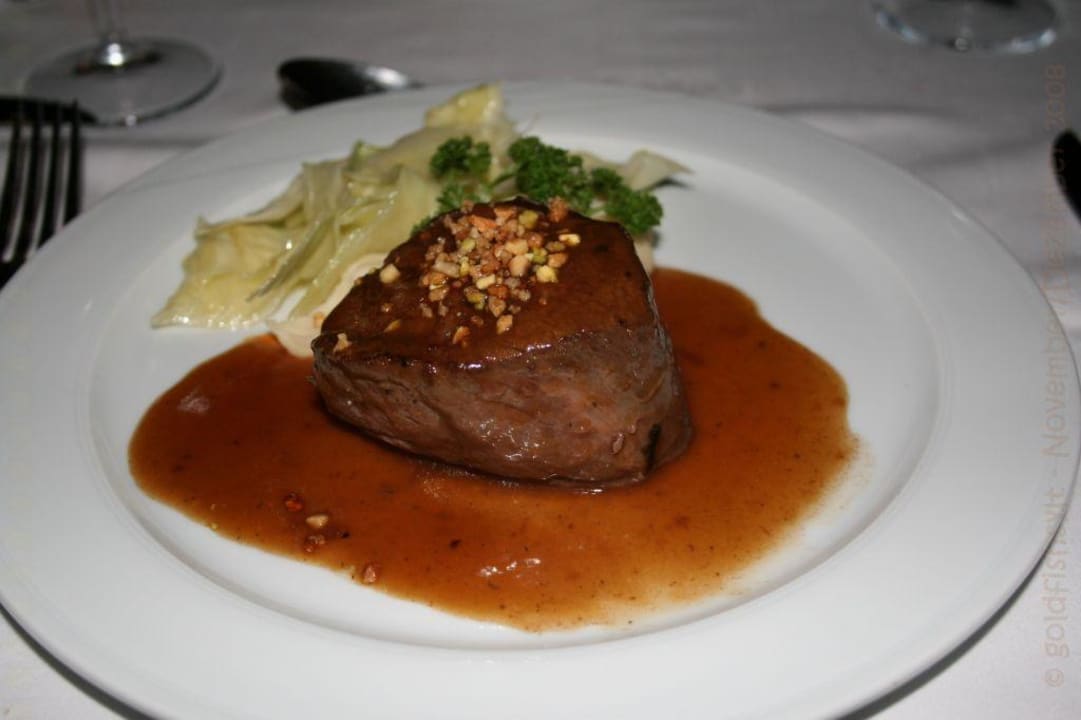 im Restaurant "Via Veneto"; das Hauptgericht "Ochsenfilet mit Pistazien Kruste und Madeira Sauce.", Teil des Menüs, das 1 x pro Woche bei HP-Buchung inbegriffen war/ist