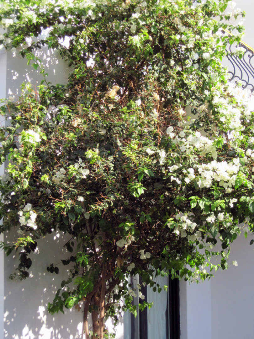 Weisse Blütensträuche an den Bungalowmauern