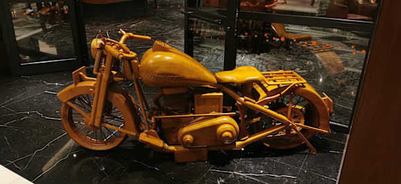 Eine Holz Harley vor dem Eingang der Sports Bar