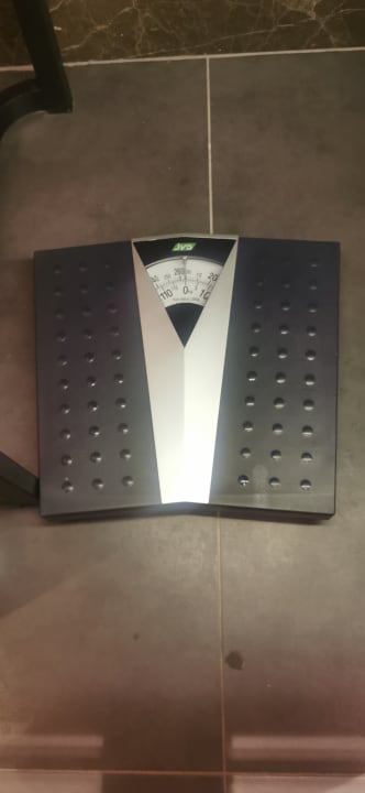Eine Waage unter dem Waschbecken im Zimmer