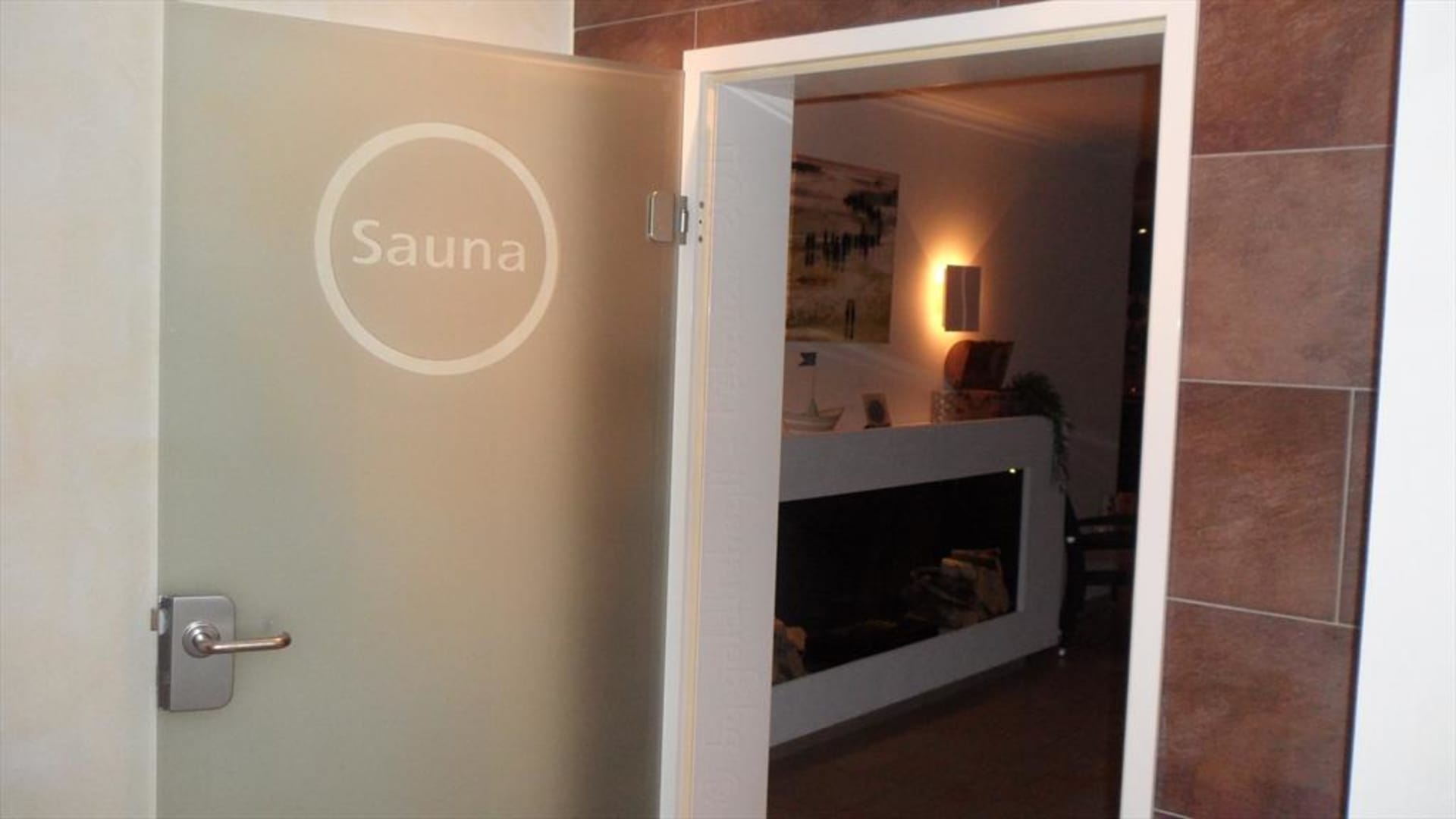 Blick vom Sauna- in den Poolbereich zu sehen der Kamin