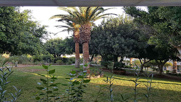 Blick vom Balkon in die Gartenanlage.