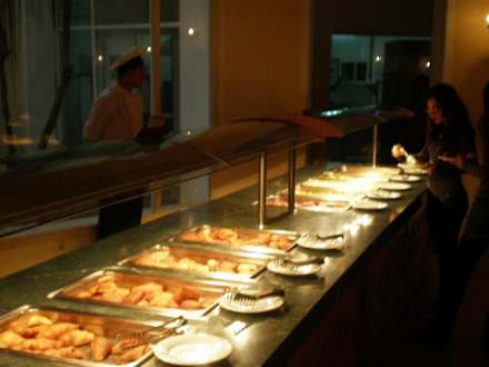 hinten warme Würstchen, frisches warmes Gemüse, Rührei etc.