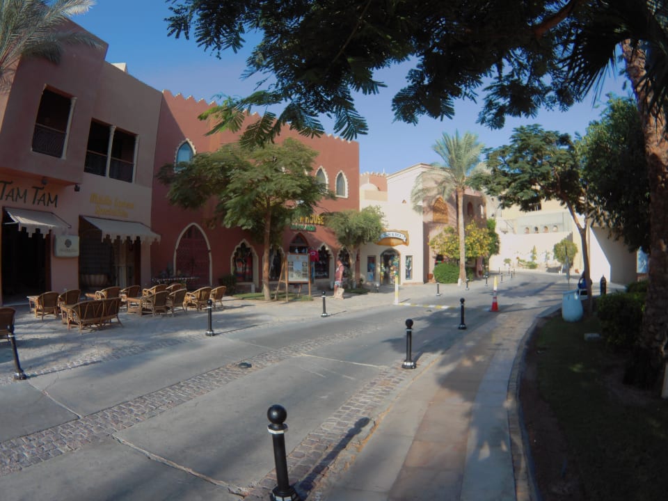 Hotelumgebung mit kleinen Souvenirshops und Cafés.