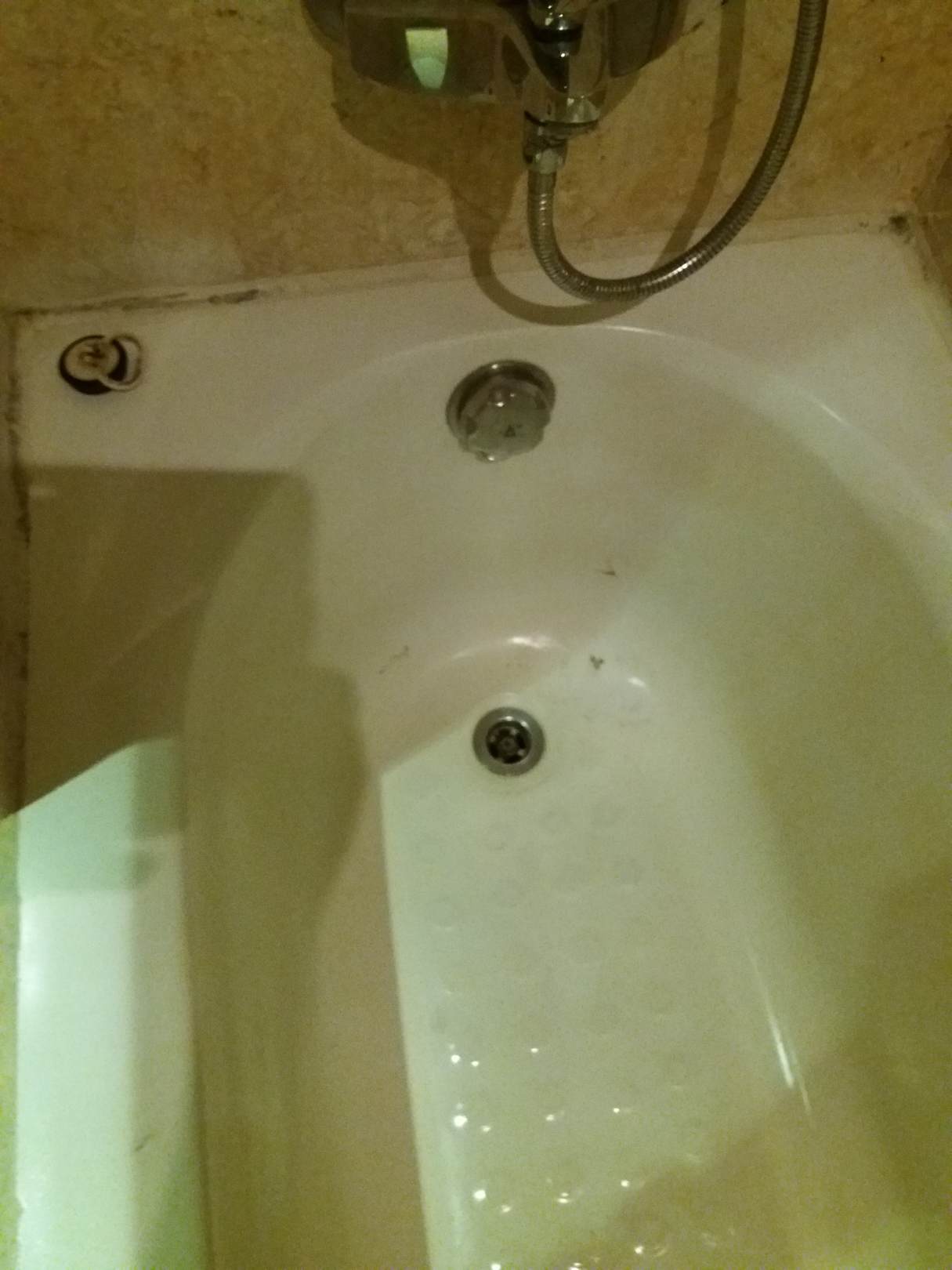 Die abgeplatzte Emaille in der Badewanne. alles sehr unhygienisch.