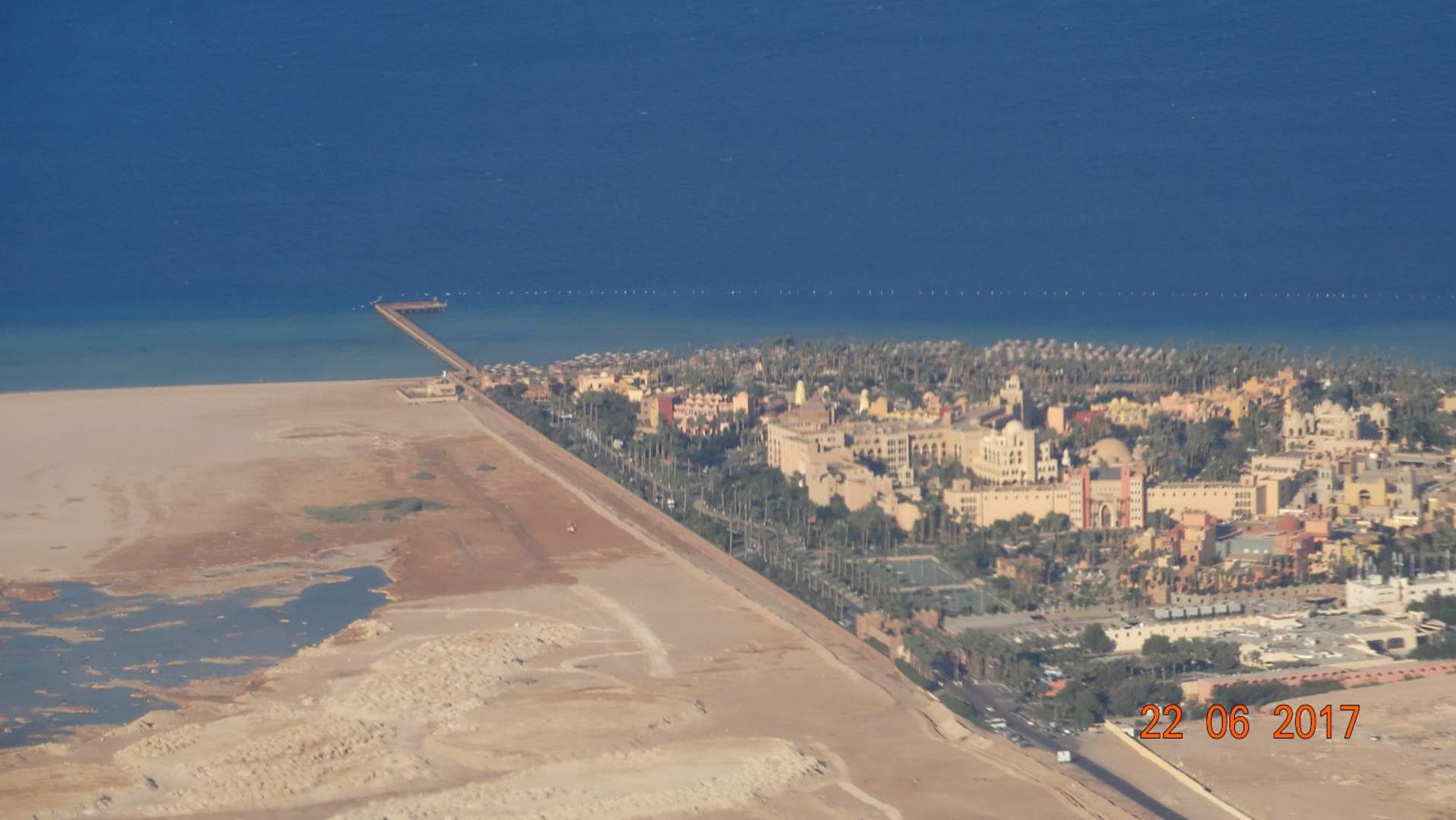 AusblickVom Kabinenfenster unseres A321, während des Anfluges auf Hurghada, ist das Makadi Palace Hotel sehr gut zu erkennen. Das Hotel liegt rechts nahe der Bildmitte und zudem ist auch der dazugehörige Steg zum Schnorcheln am Hausriff gut zu erkennen.