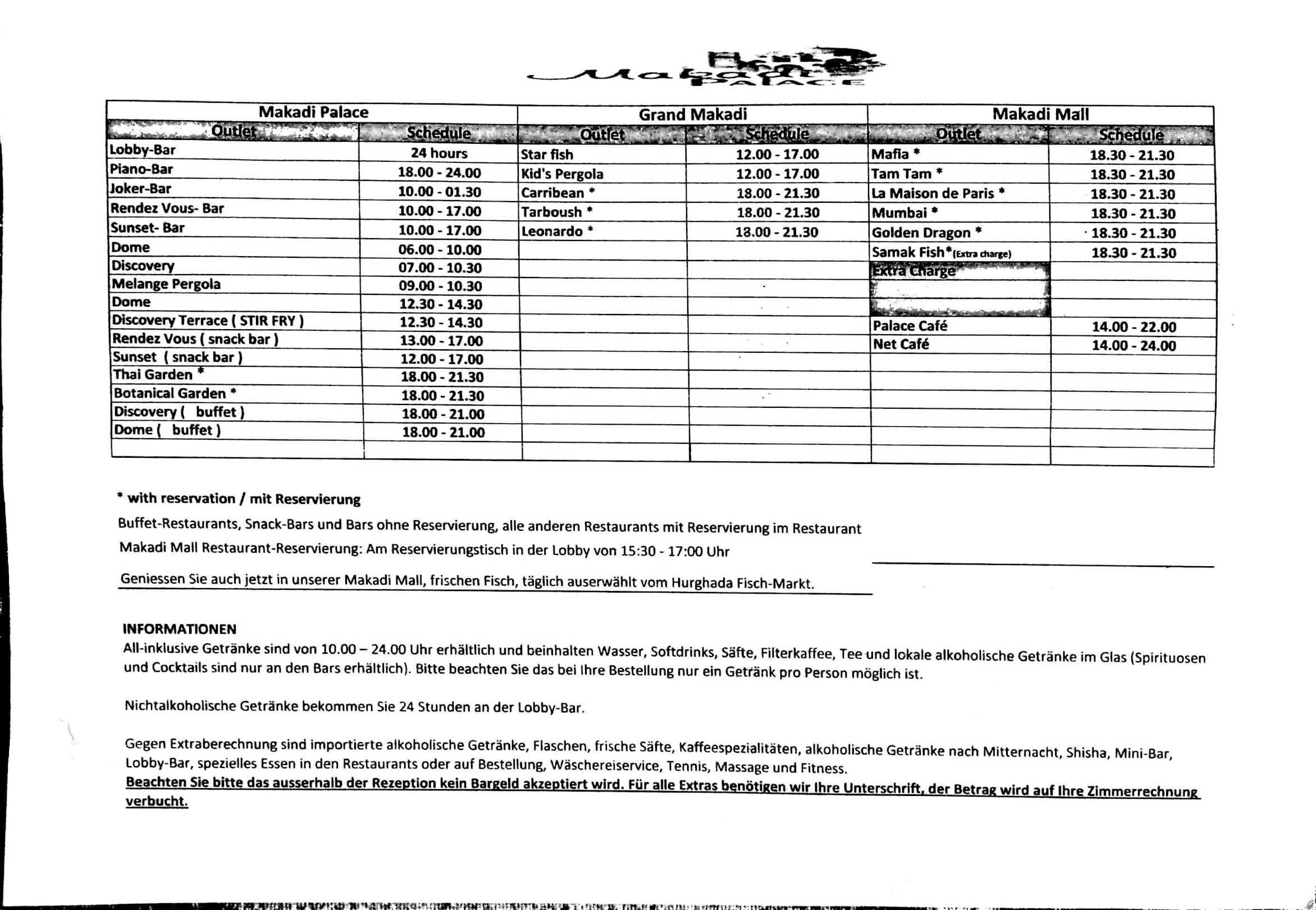 Öffnungszeiten der Bars und Restaurants