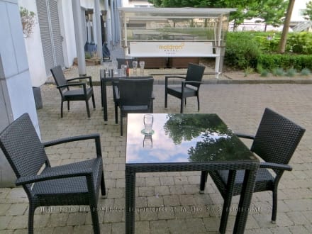 Tische mit Stühlen im Innenhof.