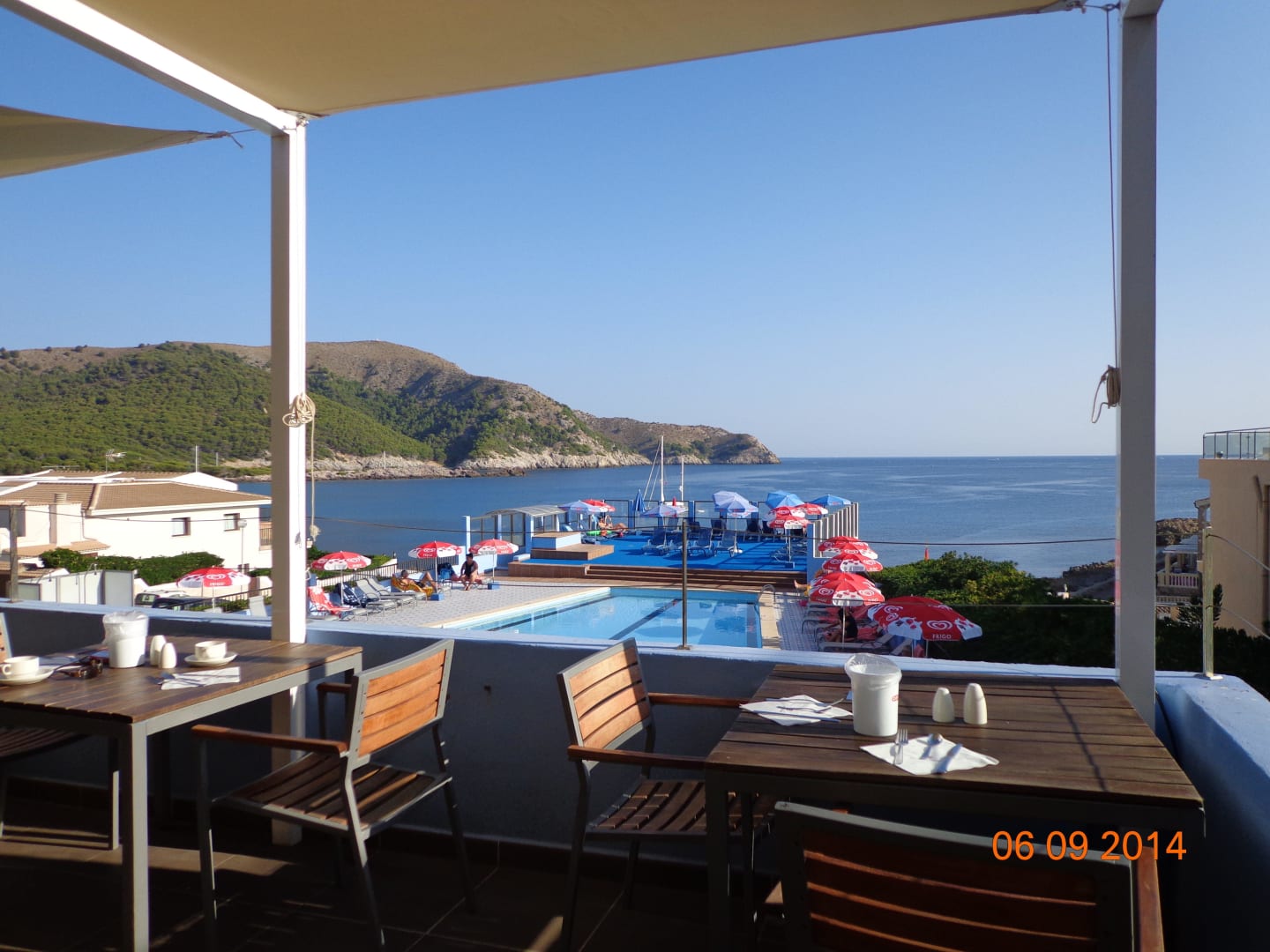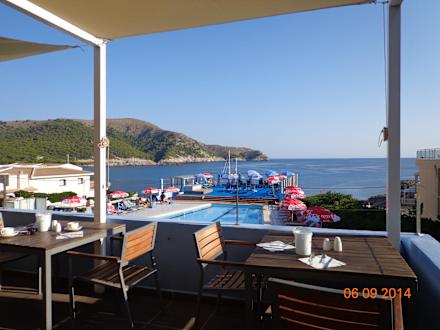 Blick von der Terrasse über Pool zum Meer