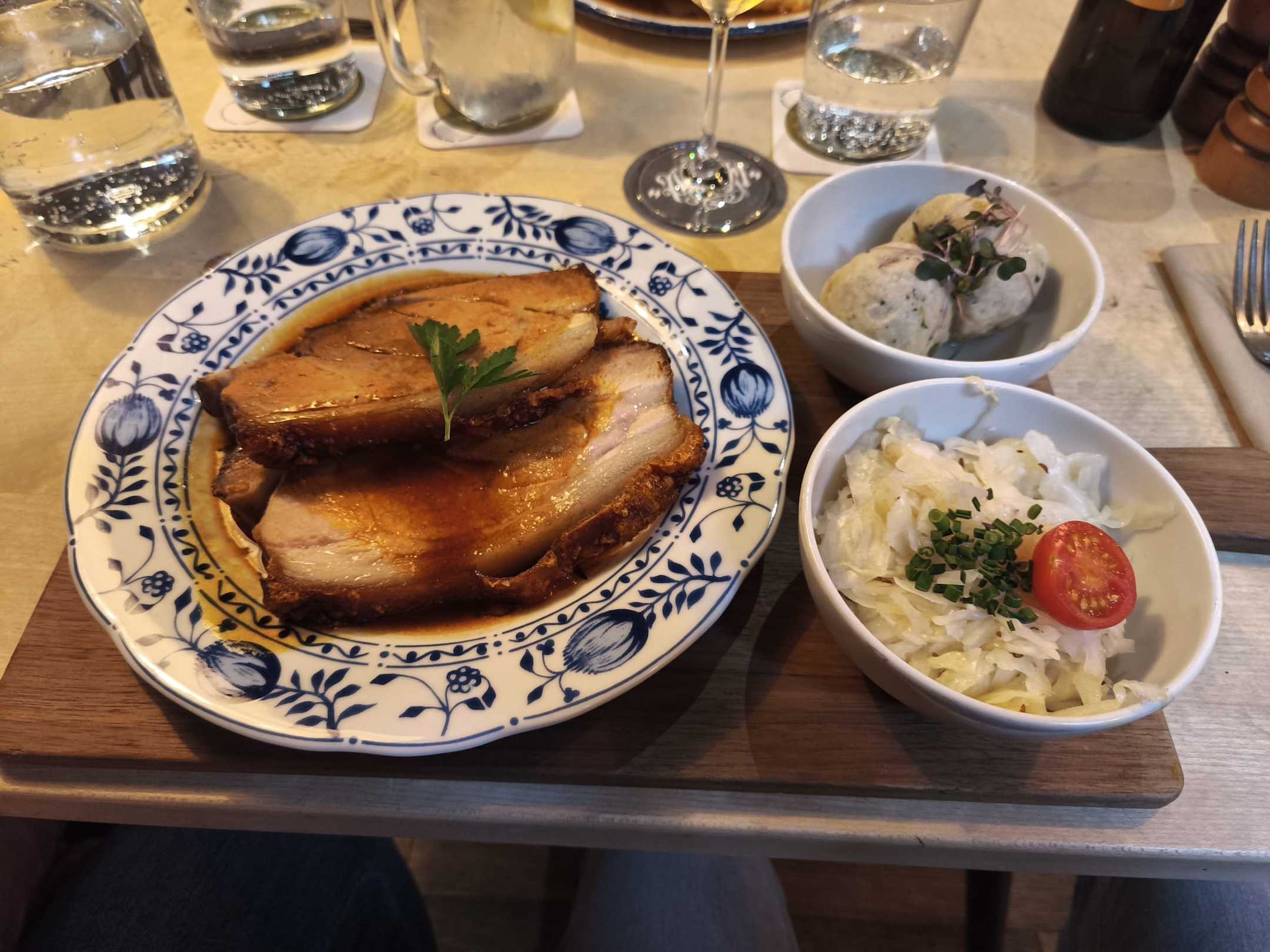Altbayerischer Schweinebrtaten, Semmelknödel mit Sauce und hausgemachten Krautsalat