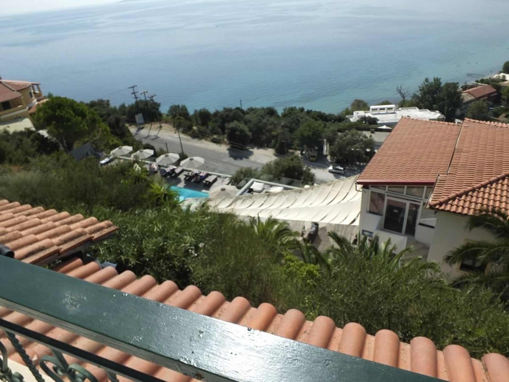 Sicht vom Balkon auf Pool und Restaurant