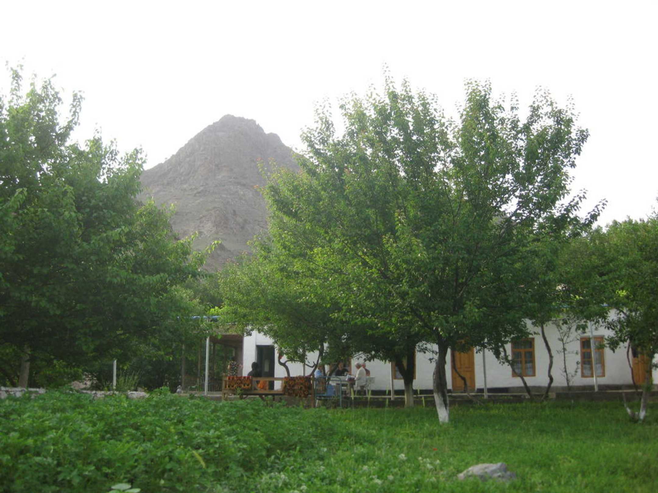 Außenansicht vom Maysara`s Gästehaus und im Hintergrund ein Berg vom Nuratau-Gebirge.