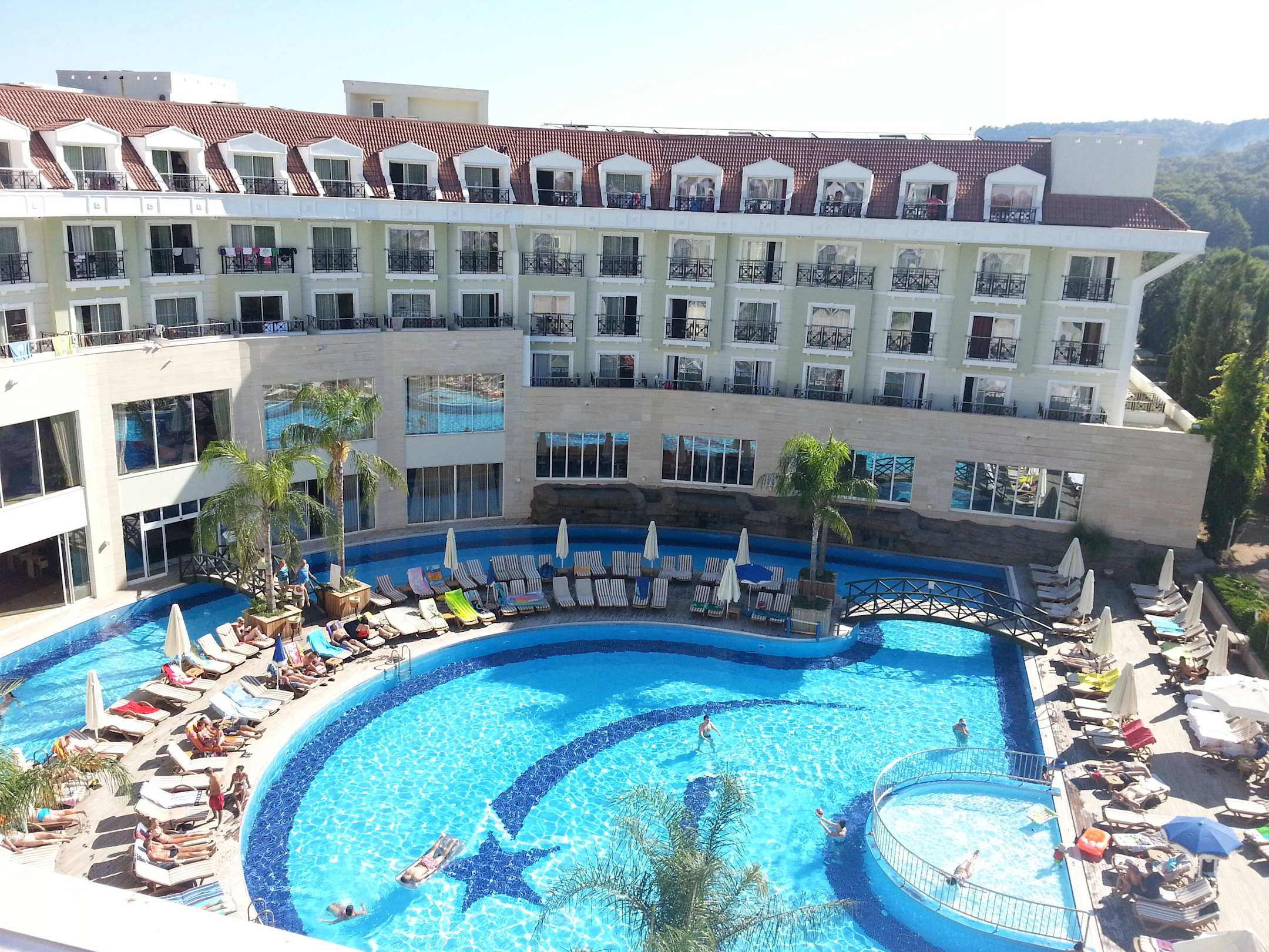 Blick vom Zimmer im 4. Stock auf den Pool