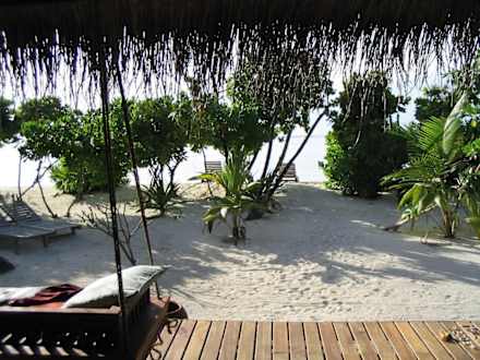 Malediven Medhufushi Strandvilla TerrasseAuf der Terasse lässt sich´s super relaxen -oder gleich noch besser am eigenen Strandabschnitt. Zu den Nachbarn sind es ca. 10m, aber ausser ein nettes, höfliches und leises " Good Morning" um 6:00 Uhr morgens, kriegt man eh nicht viel von den Nachbarn mit.