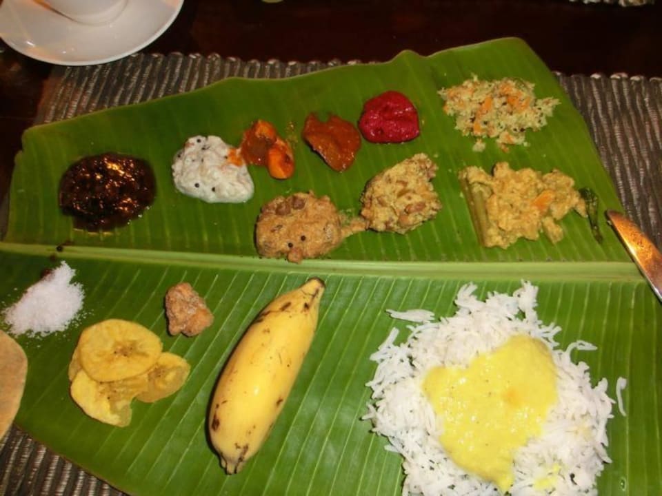 Landestypes Essen, serviert auf einem Bananenblatt