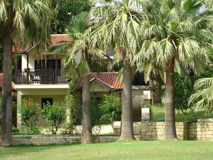Bungalows, umgeben von blühenden Büschen und Palmen