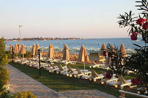 Blick über die Liegewiese und Strand zum Meer