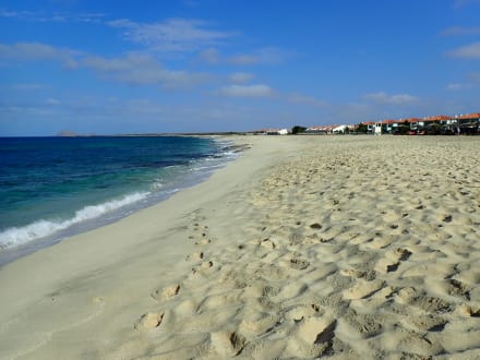 Sandstrand vor der Hotelanlage mit Felsen im Wasser.