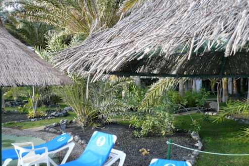 Die Sonnenschirme sind mit Reisig gedeckt, aber teilweise so zerschlissen, dass die hervorstehenden Spieße, die sich in Kopfhöhe befinden, üble Verletzungen verursachen können.