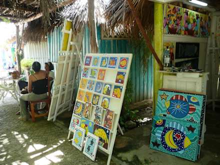 Mitten in der Gartenanlage gibt es eine "kleine Einkaufsmeile" mit kleinen bunten Hütten, die Verschiedenes verkaufen, u. a. auch selbstgemachte Bilder, Ketten. Man konnte dort aber auch Briefmarken kaufen u. v. m.