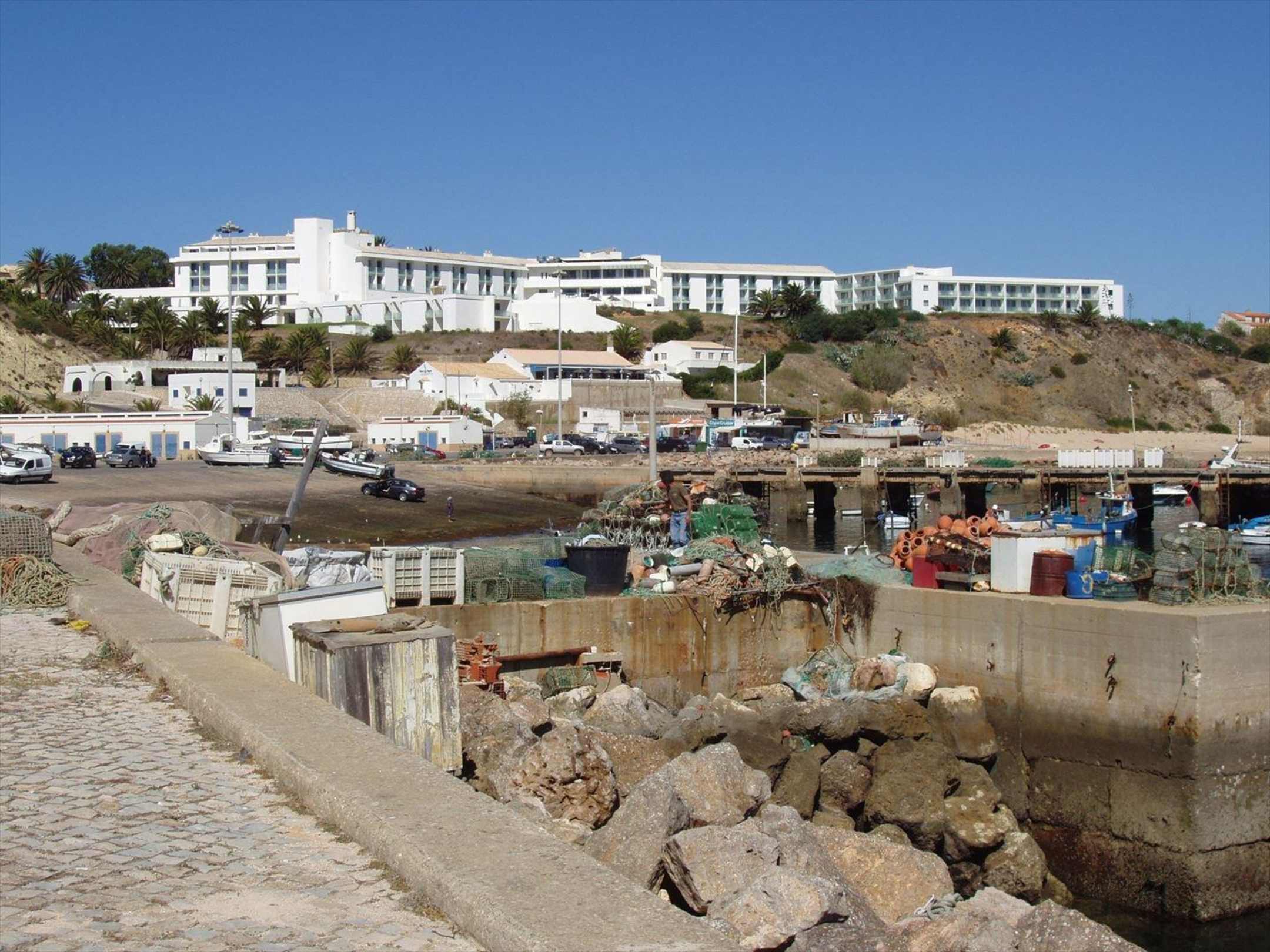 Blick vom Hafen zum Hotel