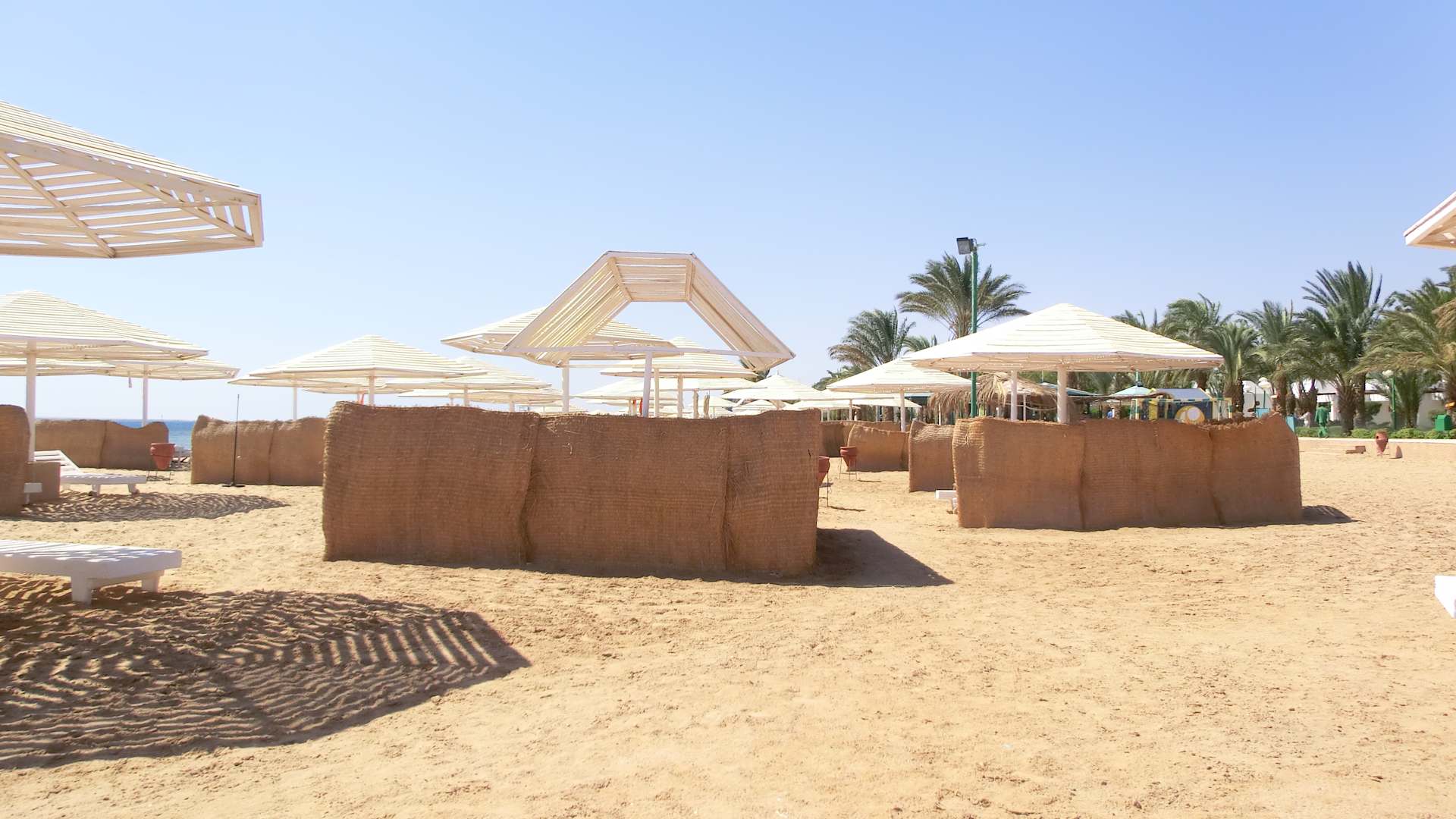 Zwischen den einzelnen Liegen und Sonnenschirmen ist tatsächlich ausreichend Platz um nicht die Gespräche der Nachbarn zu hören oder sich eingeengt zu fühlen.