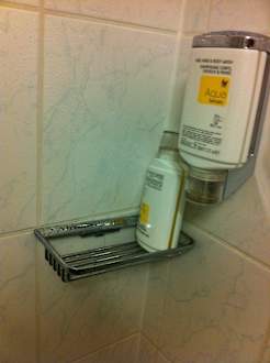 Duschgel / Shampoo ging während des duschen aus und wurde selbst am nächsten Tag nicht aufgefüllt. Nach Beschwerde bekam ich Duschgel mit. Zum Selber befüllen. Beachten Sie die liebevolle schiefe Ablage.