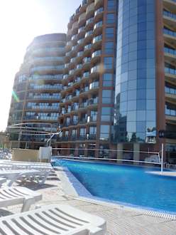 Blick vom Pool auf das Hotel