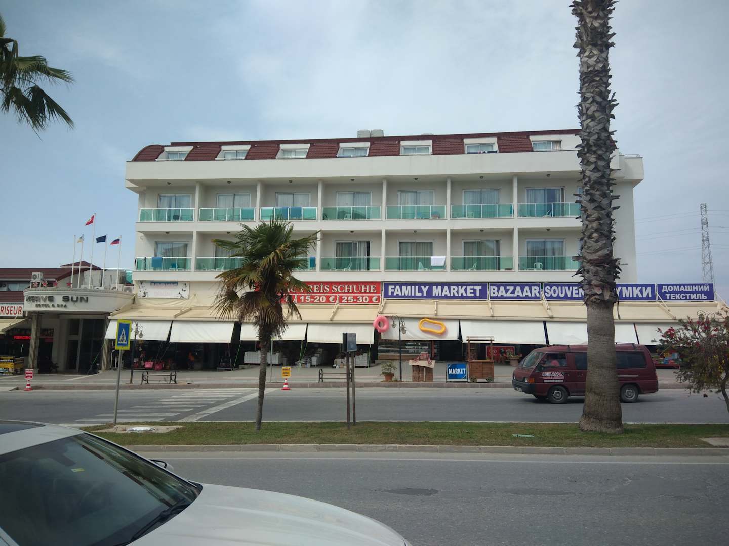 AußenansichtDie Busse sind auf beiden Seiten der Straße. Das Hotel ist gut gelegen und in 5 min ist man in Side mit dem Dolmuș(bus)