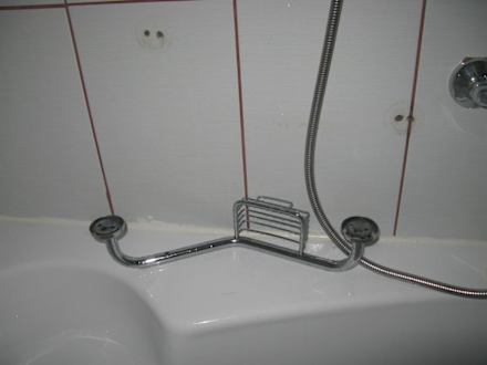 Der Haltegriff mit Seifenschale lag neben seiner Befestigung, der Hotelhandwerker hatte wohl noch keine Zeit zur Reparatur gehabt.