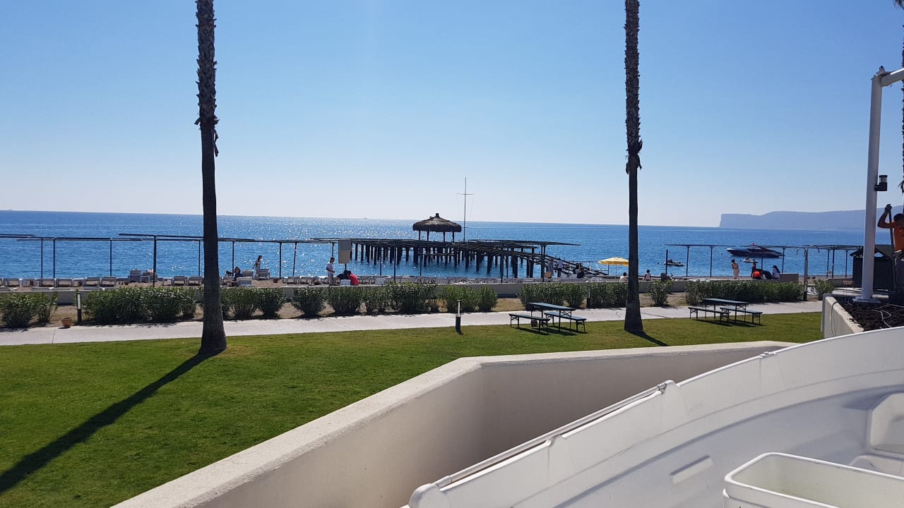 Die hübsche Pier mit Bar ... in Wirklichkeit ein unfertiges Stahlgerippe mit Bastschirm