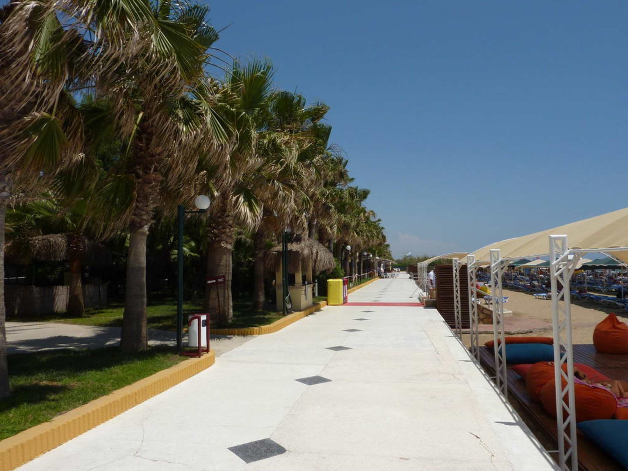 Strandweg, links Palmen mit Strandrestaurant und rechts der Sandstrand mit Liegen.