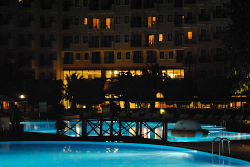 Der Abend vom Blick der Bar in Richtung Hotel