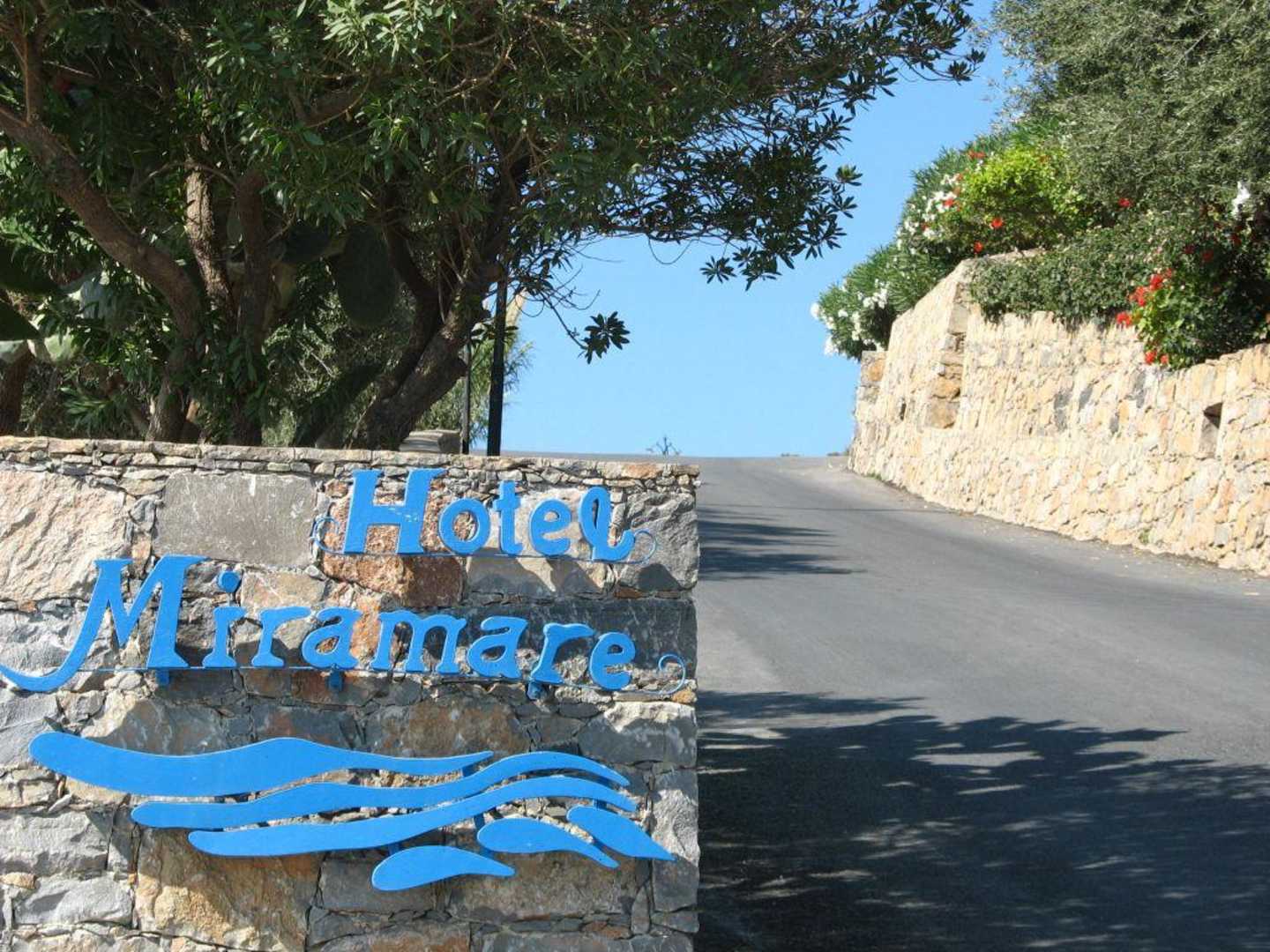 Die Auffahrt zum Hotel mit Logo.
