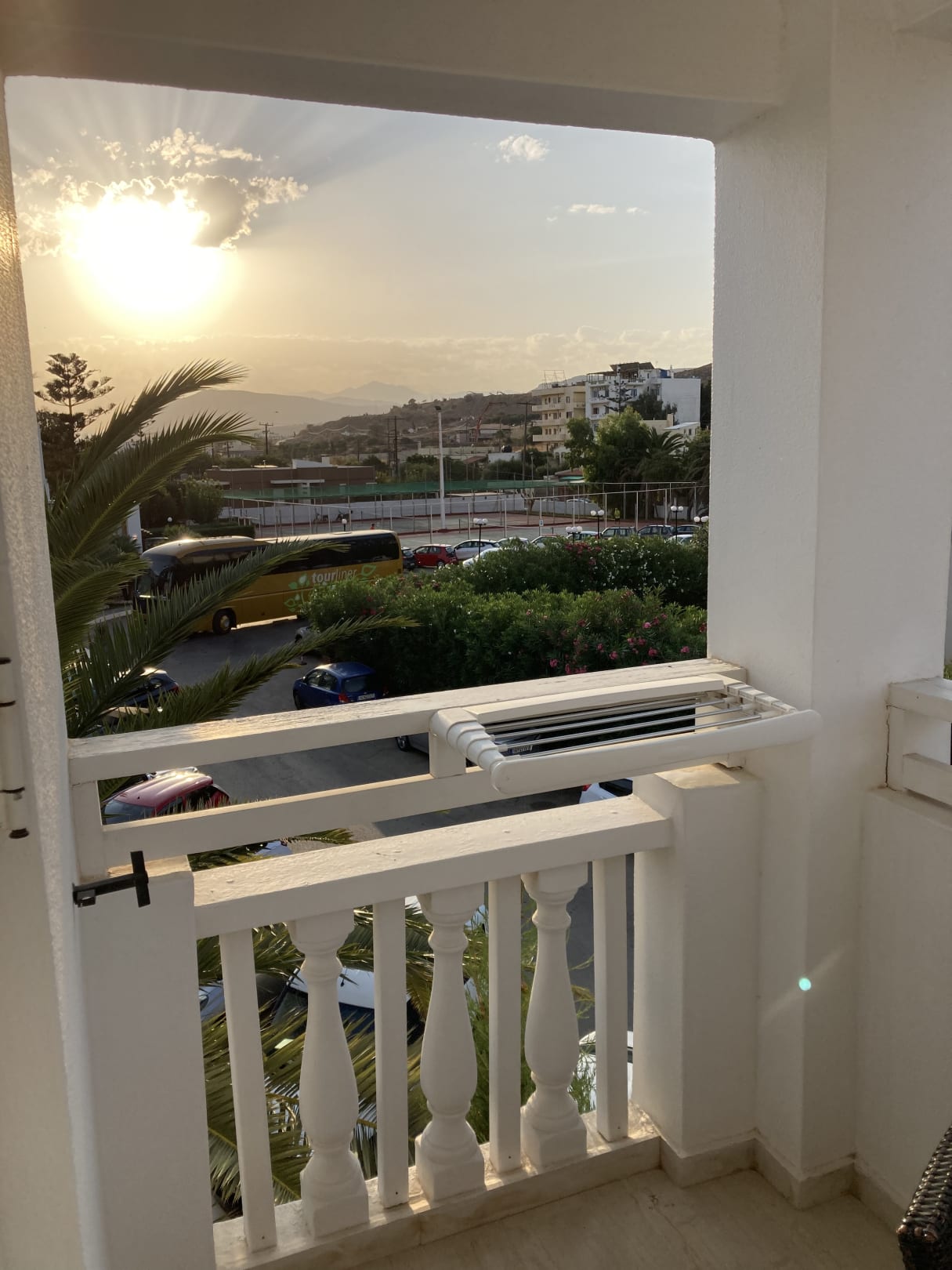 Gartenblick mit Parkplatz und anreisendem Bus, herrlich👎