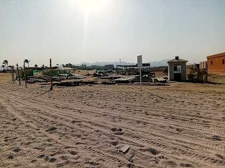 StrandLinks im Hintergrund sind die Palmen und die Sonnenschirme des Hotelstrandes zu sehen. Im Vordergrund eine Baustelle mit Metallschrott.