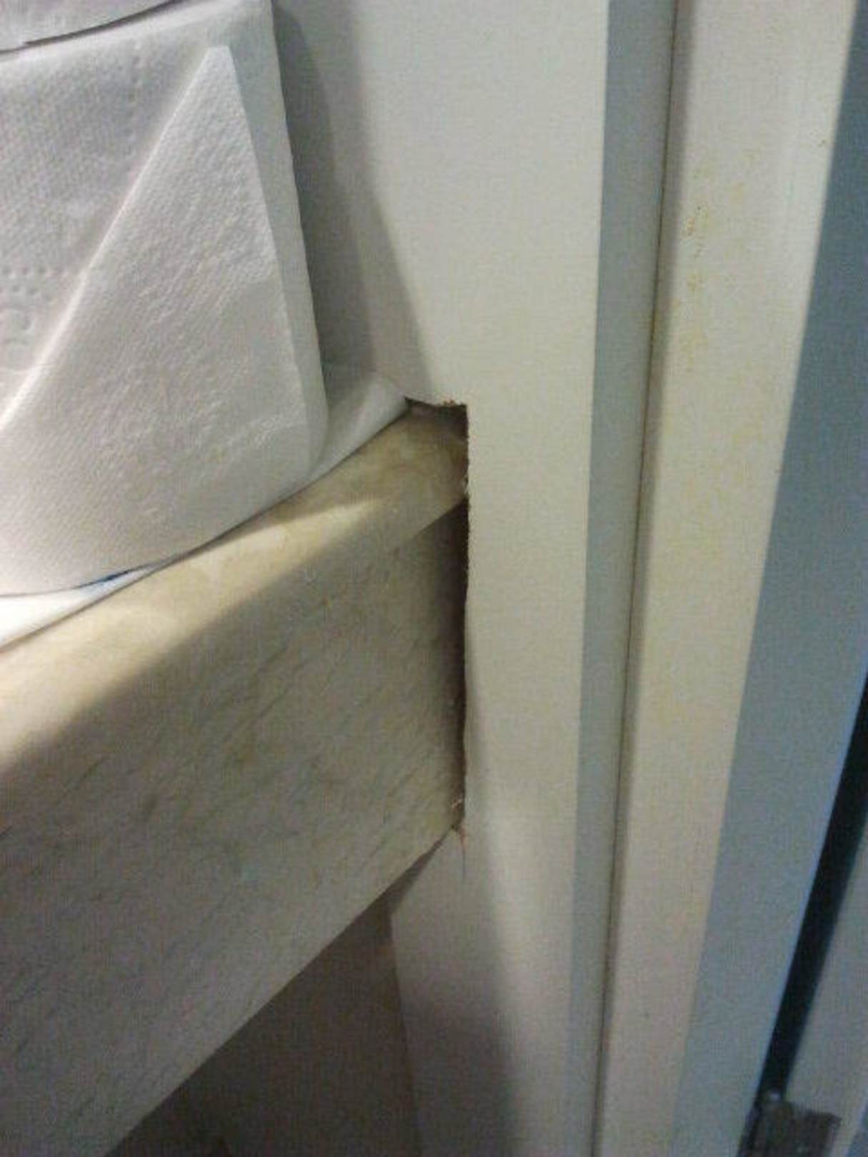 Türrahmen neben dem WaschbeckenMan hätte die unsaubere Tischlerarbeit wenigstens mit Dichtungsmaterial überdecken können.