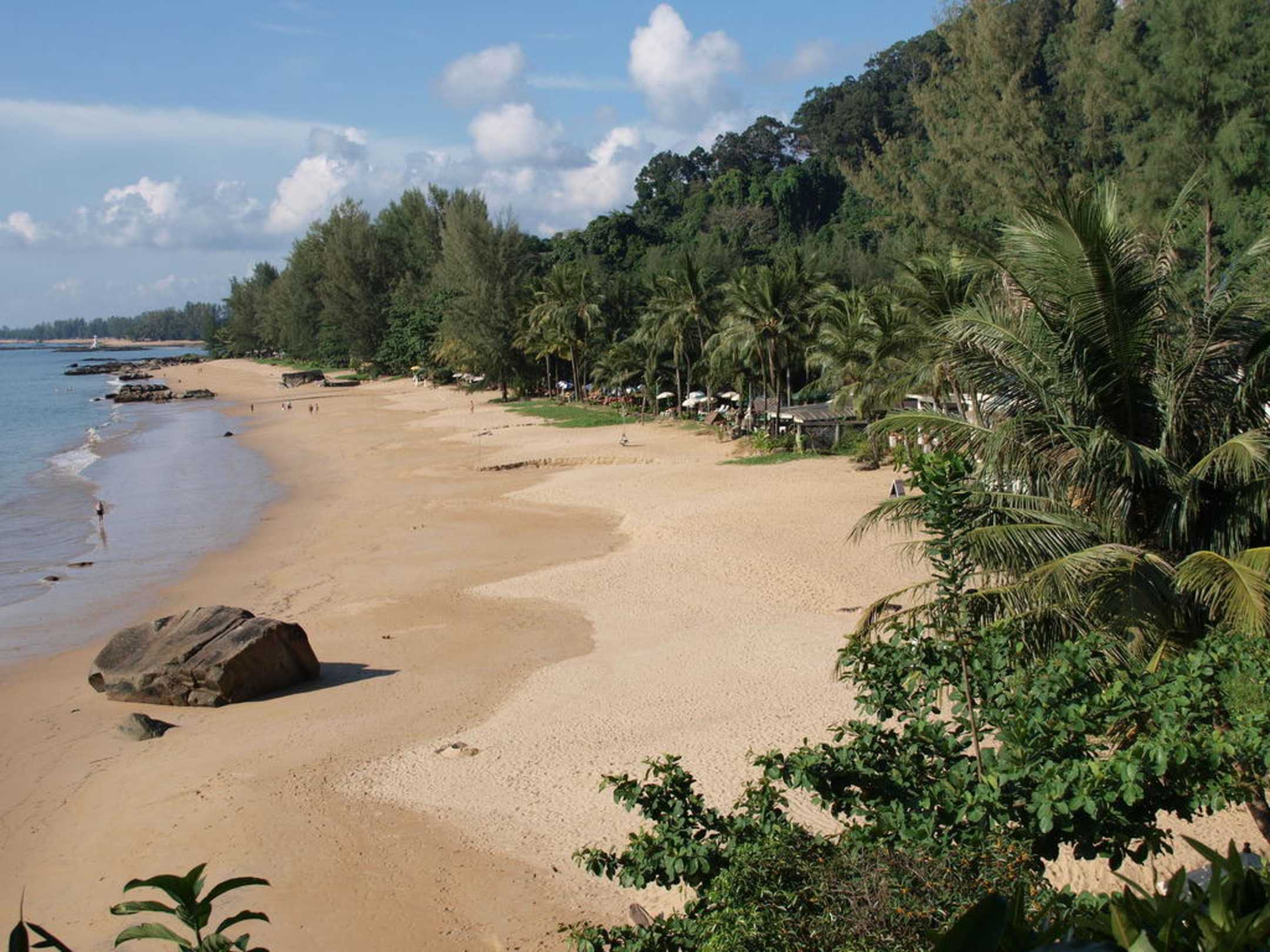 Blick von einem Restaurant auf den Sunset Beach. Der Hotelstrand befindet sich im hinteren Bereich des Bildes, beginnt hinter dem fast rechteckigen Fels am Strand- wo sich die vielen Felsen im Wasser befinden.