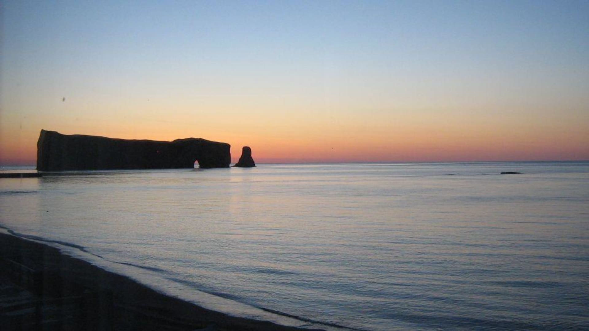 Sonnenaufgang hinter dem Rock Percé - vom Motelfenster aus fotografiert. Man konnte den Sonnenaufgang vom Bett aus sehen!