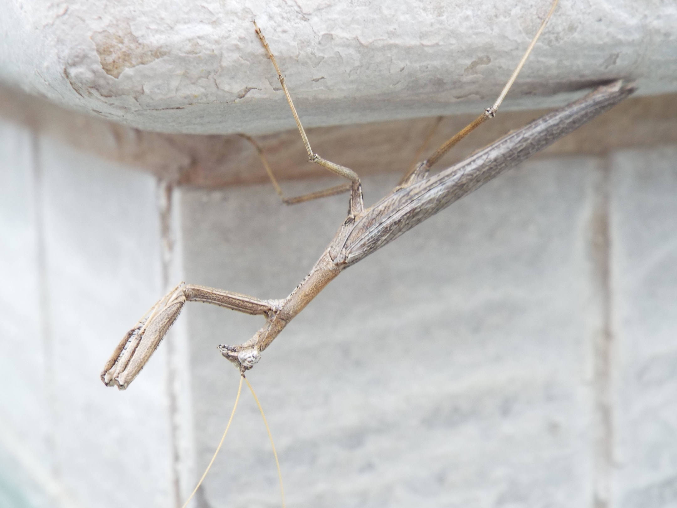 Gottesanbeterin kopfüber am Poolrand