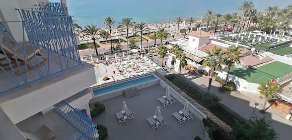 Junior Suite auf Relaxbereich, Liege Hauptpool und Strand
