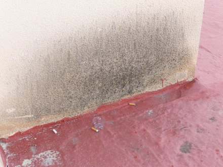 Müll auf dem Dach vor dem Balkonheruntergekommene Außenfassade mit Müll und Kippen von oben