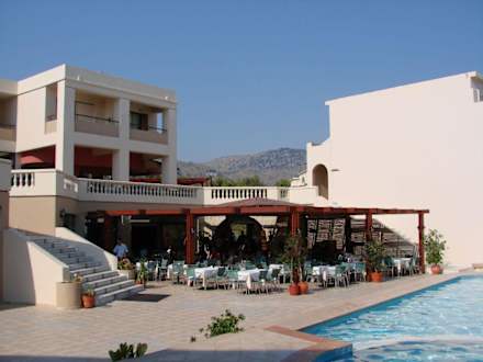 EssensbereichBlick am Hotelpool auf den Aussenbereich des Restaurants. Im Hintergrund ein Teil des Hauptgebäudes.